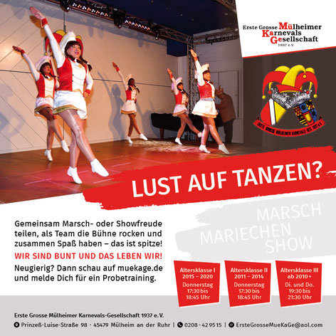 Wir suchen Dich: Mädels und Jungen ab 4 Jahren, die Lust und vor allem Spaß am Tanzen haben. Wir bieten Euch abwechslungsreiche Show- und Musical-Tänze sowie den traditionellen Marsch- oder Mariechentanz an. Somit ist für jede Wunsch-Stilrichtung etwas dabei.